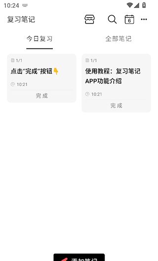 1、进入复习界面,可以看到今日需要复习的笔记,复习后点击笔记下的完成。