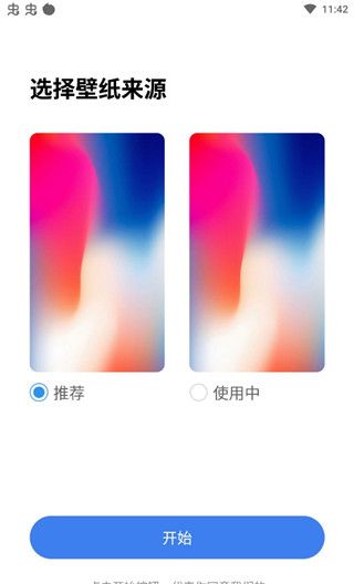 1、下载好app后,点击进入,开局会有推荐壁纸,也可以不选择继续使用原来的壁纸,这里我已经选择过了所以两个都是一样的,点击【开始】即可正式使用。