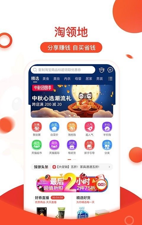 《淘领地》是一款领券购物软件,app商品种类繁多,分类也很齐全,包含种类丰厚多样,拥有丰富大额优惠券,可以帮助轻松省钱购物,新用户注册登录就能获得大量奖励,在这里分享可以得到佣金,一边省钱还能一边赚钱,所有商品都能一键购买下单,快来下载淘领地体验吧。