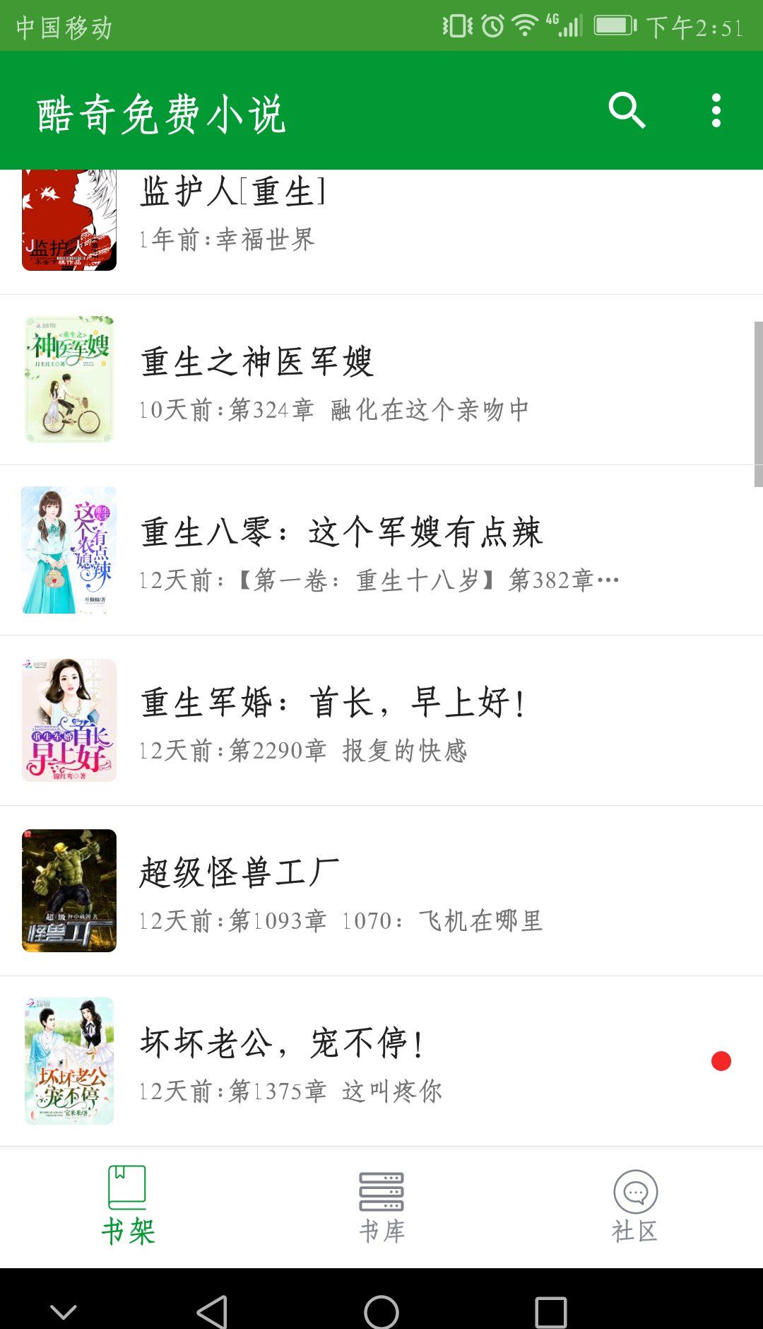 2、连载章节自动更新,会在书架上显示最新章节。