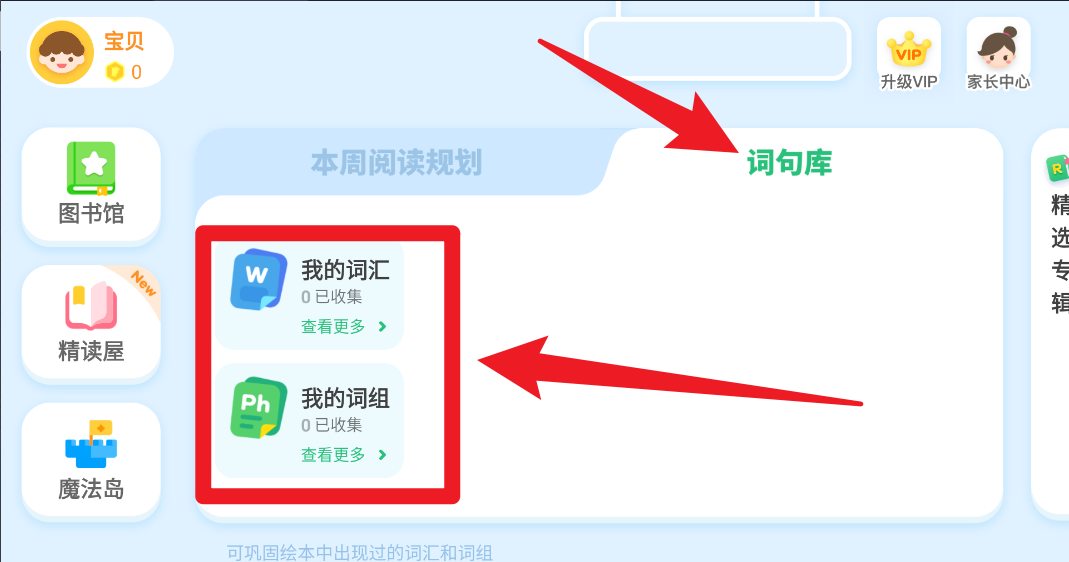 2、切换至“词句库”页面,可查看孩子在阅读中积累的词汇与词组,支持进一步复习与扩展学习内容。
