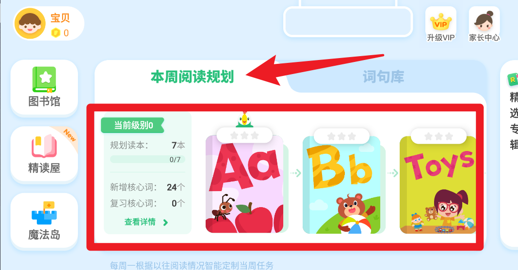 1、点击“本周阅读规划”可查看当前等级阅读任务,系统会自动分配每周7本绘本及相关核心词数量以辅助学习。
