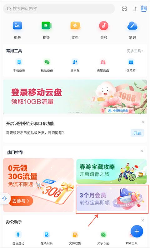 1、在中国移动和彩云首页点击“3个月会员”即可领取