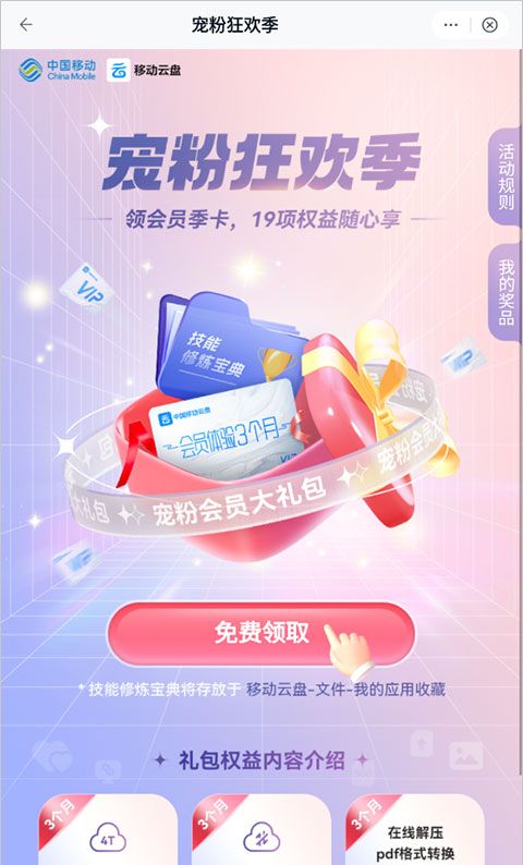 查看方式:移动云盘会员权益可通过“移动云盘APP -我的-会员中心(顶部卡片)”查看。