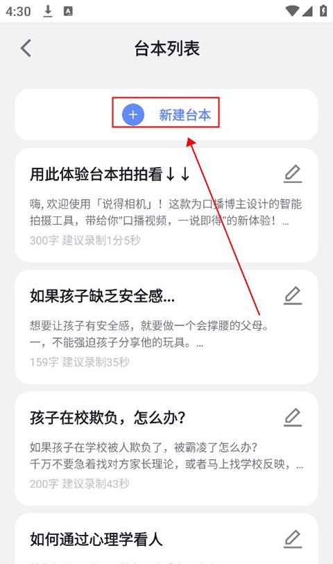 2、在这里可以看到模版台本,用户可以直接使用模版或者点击上方新建台本。