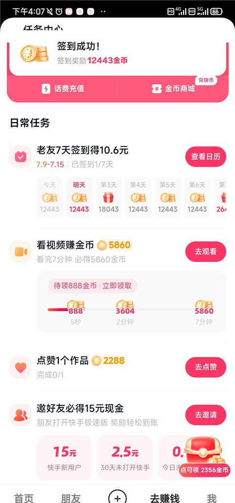 App内"任务"或"去赚钱"页面会列出每日任务。