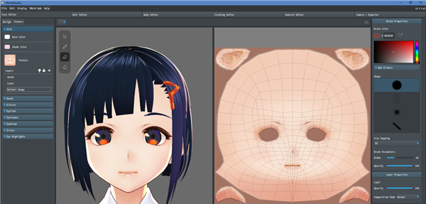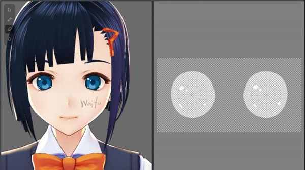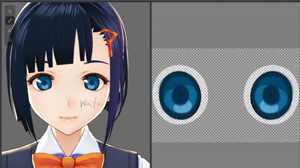 4、左边是实时的3D模型,右边是贴图摊开的样子,最右边是选择画笔和颜色。在左边选择一下要作画的图层。这里有三层,Default Image是原本的贴图所在的图层,Guide这层则不会显示在最终结果中。我个人习惯直接使用Layer这一层。那么,在最右侧一栏选好颜色与画笔,在右边的贴图上写几个字,尝试一下吧。然后再把鼠标挪到左边的3D模型上画一画。没错,模型上也是可以直接作画的。同之前改变脸部部件的形状一样,我们在左边的侧边栏一路往下设置。Mouth是嘴内部、Scleras是眼白、Eyeline是眼线、Eyelashes是睫毛、Eyebrows是眉毛……这些其实不太需要修改。有兴趣的话,你可以修改一下眼线、睫毛与眉毛的颜色。Base Color是基本色,Shade Color是阴影部分的颜色。然后就到了非常重要的Irises——虹膜,也就是眼睛中央有颜色的部分。