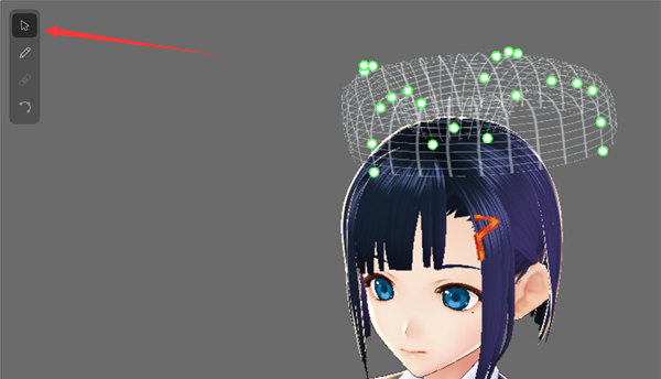 再往下,下面的每一栏都是一个曲面。随便点一个,你就能看到曲面网格,还能看到一些被黄色边框选中的头发,这些就是属于这个曲面的头发。拖动绿边白点,你就可以改变曲面的形状。这里同样可以使用右上角的按钮实现左右/前后对称操作。