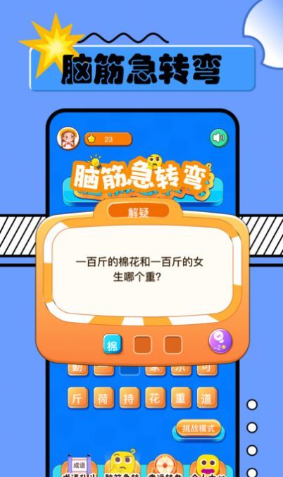 2334乐园app下载安装一款非常不错的智力游戏应用盒子。在这个软件中有非常多益智烧脑小游戏,脑筋急转弯、成语猜猜看、成语乱斗等多个不同的分区,你可以选择不同题材的游戏进行挑战,每一类游戏都会有海量关卡等待你来解开谜题,如果你想要一款能够让自己开转脑筋的游戏那就下载这款游戏盒子试试吧。