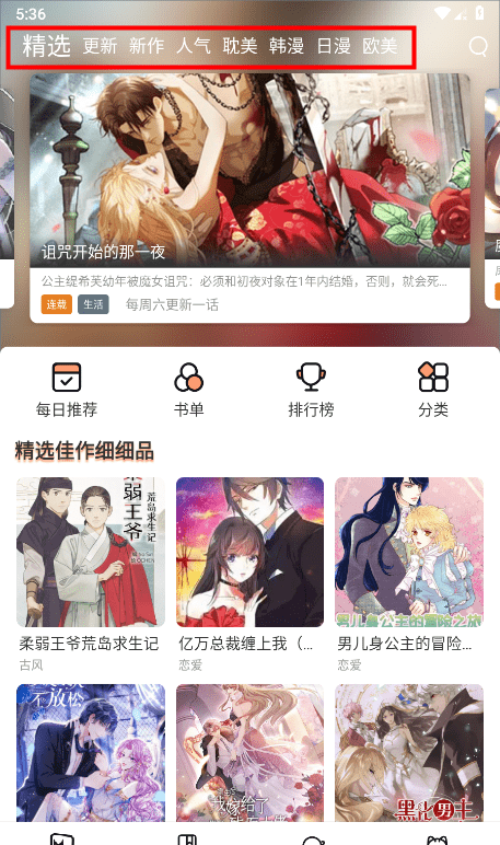 2、在app首页,我们可以看到精选、更新、新作、人气、耽美、韩漫、日漫、欧美等多个板块。