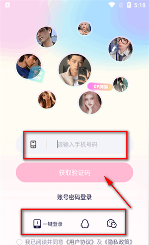 3、输入手机号码,获取验证码就可以注册登录,也可使用qq、微信一键登录。