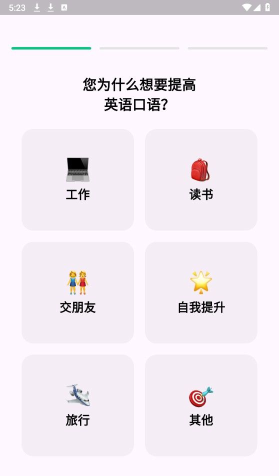 2、进入首页,首先需要回答几个学习英语口语相关的问题,以便更好的为你制定学习任务以及计划。