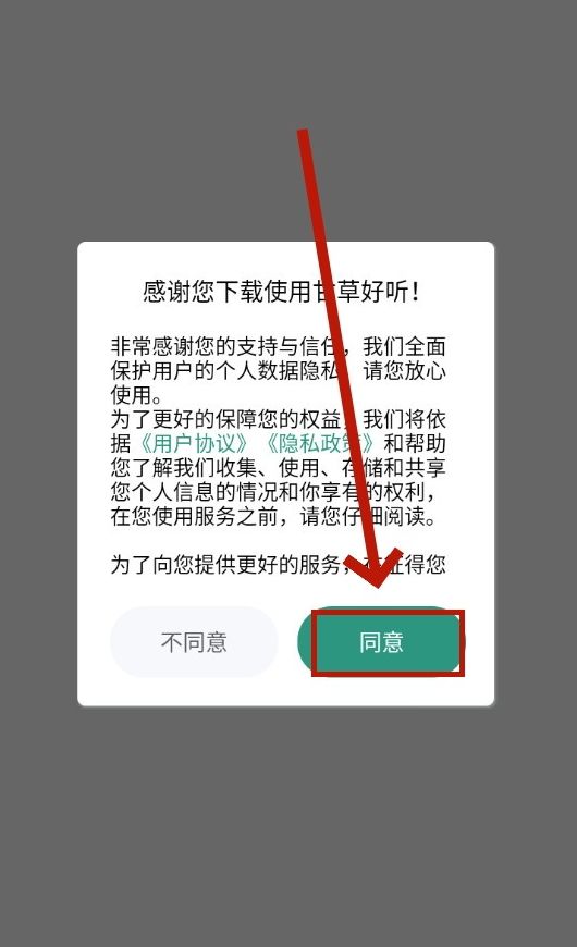 1、下载安装并打开甘草好听App,点击同意;