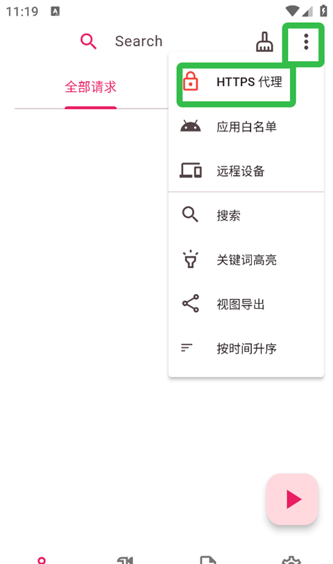 1、打开ProxyPin,点击右上三点标识,点击【HTTPS代理】。