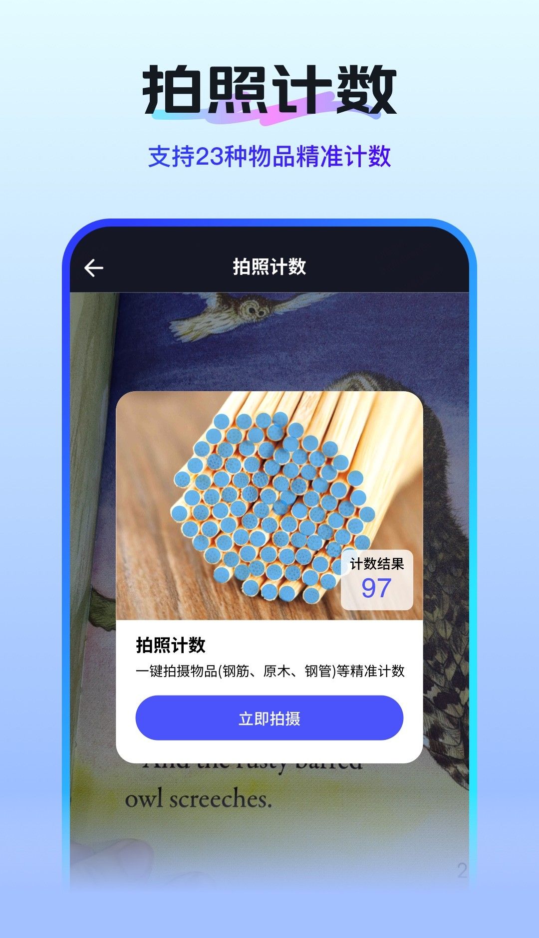 1、智能拍照计数:无需手动,全能王通过一键拍照即可识别并准确计数,无论是工地上的建筑材料,还是家中的小物件,都能快速解决计数难题,让效率倍增。