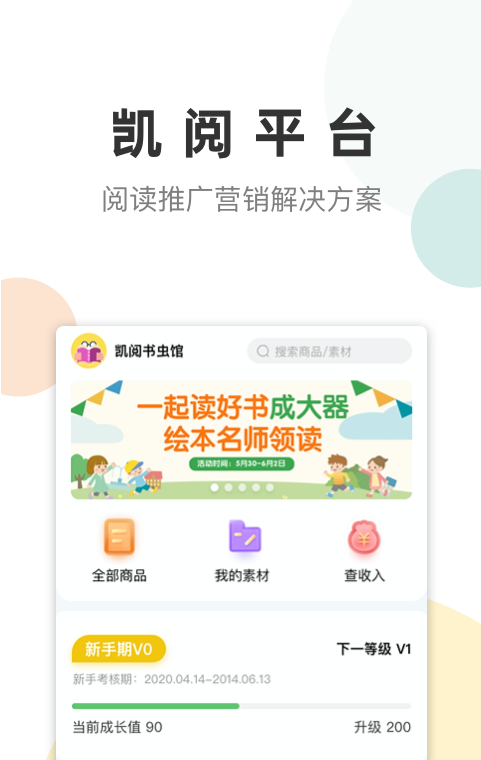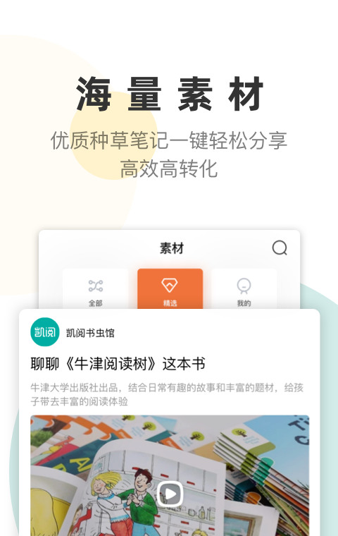 凯阅是一款极具价值意义的有关亲子阅读推广的软件,平台通过招募、孵化更多专业且有温度的阅读推广人,把高品质的亲子阅读产品和寓教于乐的亲子阅读方式带给每一个家庭,帮助中国家庭形成亲子阅读的理念与习惯。平台内开设推广学院,将会带领你从绘本知识到营销推广,构建你全方位的知识体系。平台为你提供“海报+短视频+图文”推广素材,每天只需动动手指,素材一键分享朋友圈。