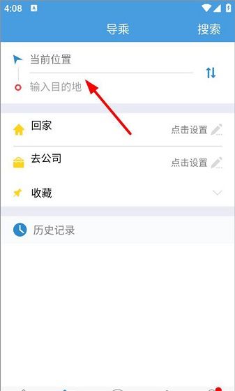 2、打开导乘页面,用户可输入当前位置和目的地搜索公交信息,也可以设置回家和去公司的路线。