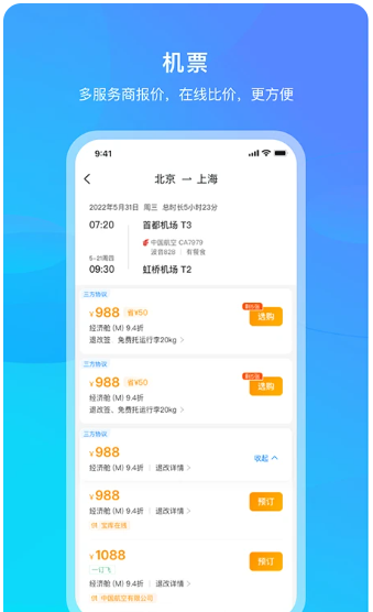 4、机票:可快速查询各地区机票,直接在平台上预订机票。