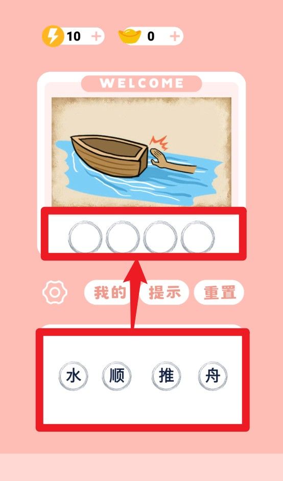1、根据图片提示选择成语,需依照顺序点击下方文字组成正确答案,如“顺水推舟”。