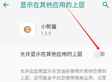 1、开启手机里的小熊猫辅助器程序,点击允许显示在其他应用上层的按钮。
