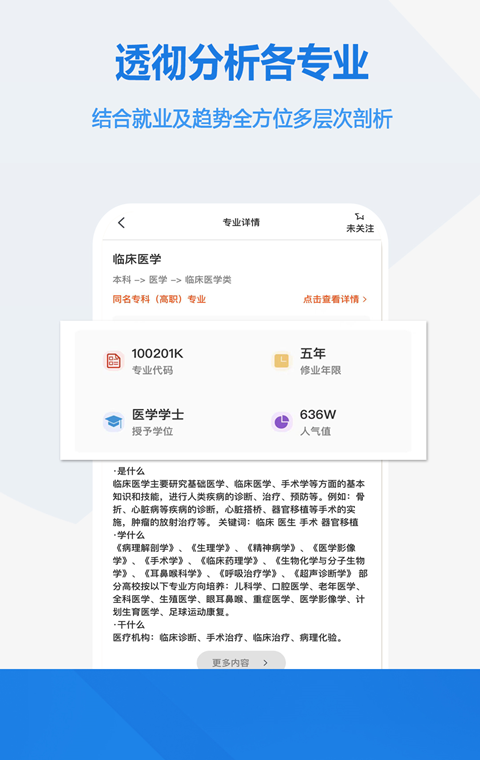 3、大学和专业数据库:覆盖全国3000多所大学和700多个本科专业,包括就业前景、学科评估和特色专业信息。