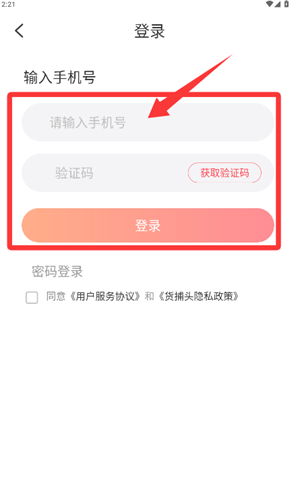 1、登录界面输入手机号及验证码,点击登录完成账号验证。