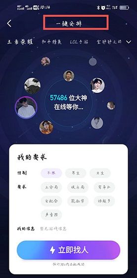 3、一键快速匹配:根据游戏、段位、性别、语音偏好智能推荐陪玩师,30秒极速开玩。