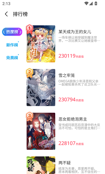 2、点击排行榜,有热度最高的几个漫画,大家可以随意阅读,或者看着新作榜,都是最近新出的好看的漫画。