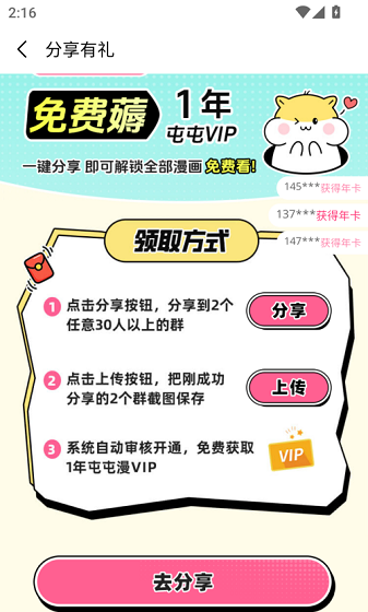 4、想要免费看呢,获得一张年卡,记得去分享软件哦!