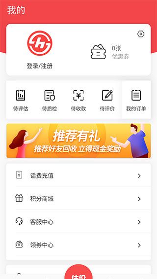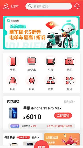 1、进入软件【首页】之后,我们就能看到一些常见的回收品类,如手机、笔记本、平板、相机等。