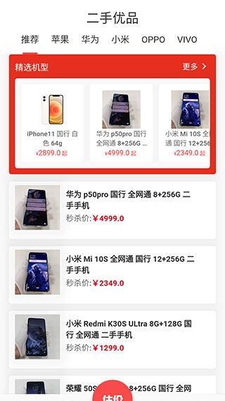 4、【二手优品】页面则为我们提供了各种机型的二手货源,用户可以在此以超低的秒杀价格来进行购买。