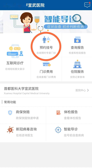 1、绑定就诊人后,在“首页”点击“预约挂号”;