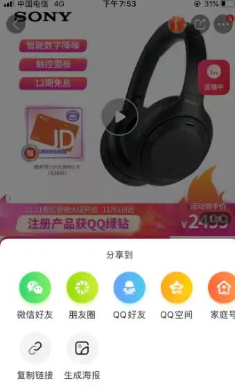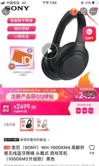 1、首先我们在京东app中选择好一件推广的商品,然后点击其商品详情页面右上角的分享图标。