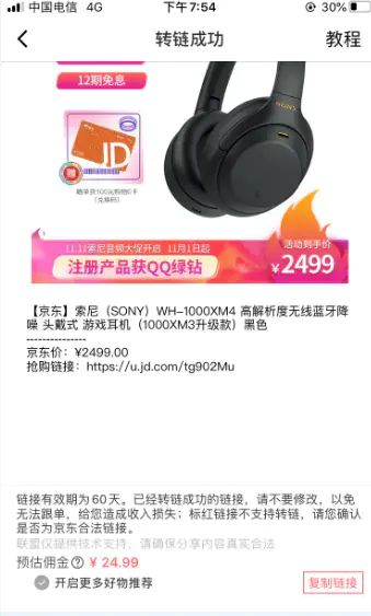 5、此时用户可以看到,转让完成后,将给出估计的佣金价格,用户点击页面底部【立即分享】,用户将商品分享到其它平台或者其他用户后就可以前往京粉app中的【佣金】页面中进行佣金提取。