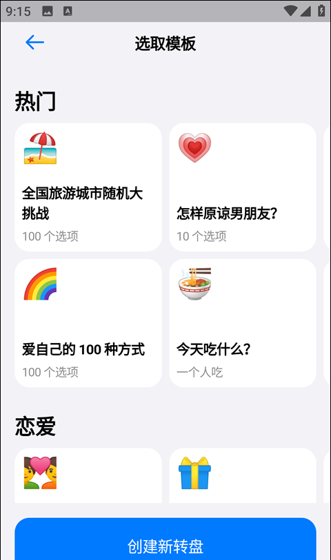 2、在这可以可以看到有诸多模板选择,然后我们点击下方的创建新转盘