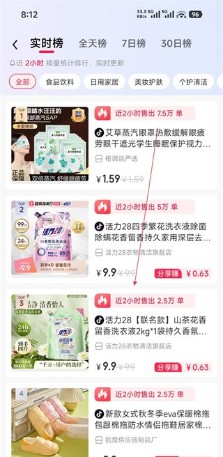 2、进入实时榜页面选择分类查看商品,点击感兴趣的商品,进入详情页,查看价格规格等信息。