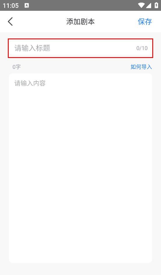 3、在添加剧本页面,先输入标题,再输入剧本内容,完成后点击保存按钮。