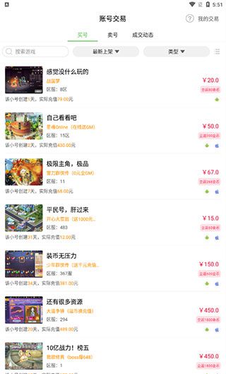 4、点击第三个模块,切换为交易区域,在这里你可以出售游戏账号或购买游戏账号。