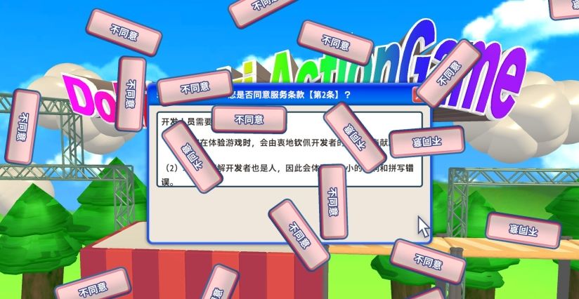 《同意用户协议(Agreeee)》是由个人开发者べすとまん开发并发行的一款心跳动作游戏,支持简体中文。游戏的玩法非常简单粗暴,在限定时间内,玩家需通过一堆反直觉、反常识、反人类的操作,完成12 使用条款的“同意”,然后一口气冲完整个心跳动作关卡。重点不是你看不看条款,而是你能不能在混乱中保持理智。