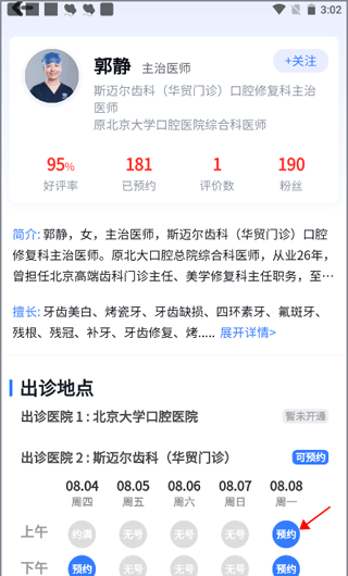3、进入医生个人界面,选择预约日期和时间,点击“预约”。