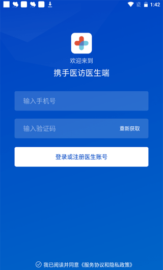 1、打开软件后,将显示登录界面。输入您的电话号码和验证码,勾选“已读”,然后单击“登录或注册医生帐户”。