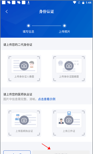 3、最后一步是上传您的身份证和医生执业证书。上传后,点击提交审核,系统后端将进行审核。一旦审核成功,就意味着注册完成。
