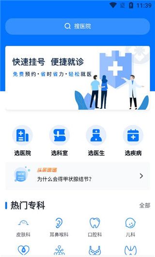 3、然后在主页上搜索医院,或直接选择医院、科室、医生,或选择疾病。