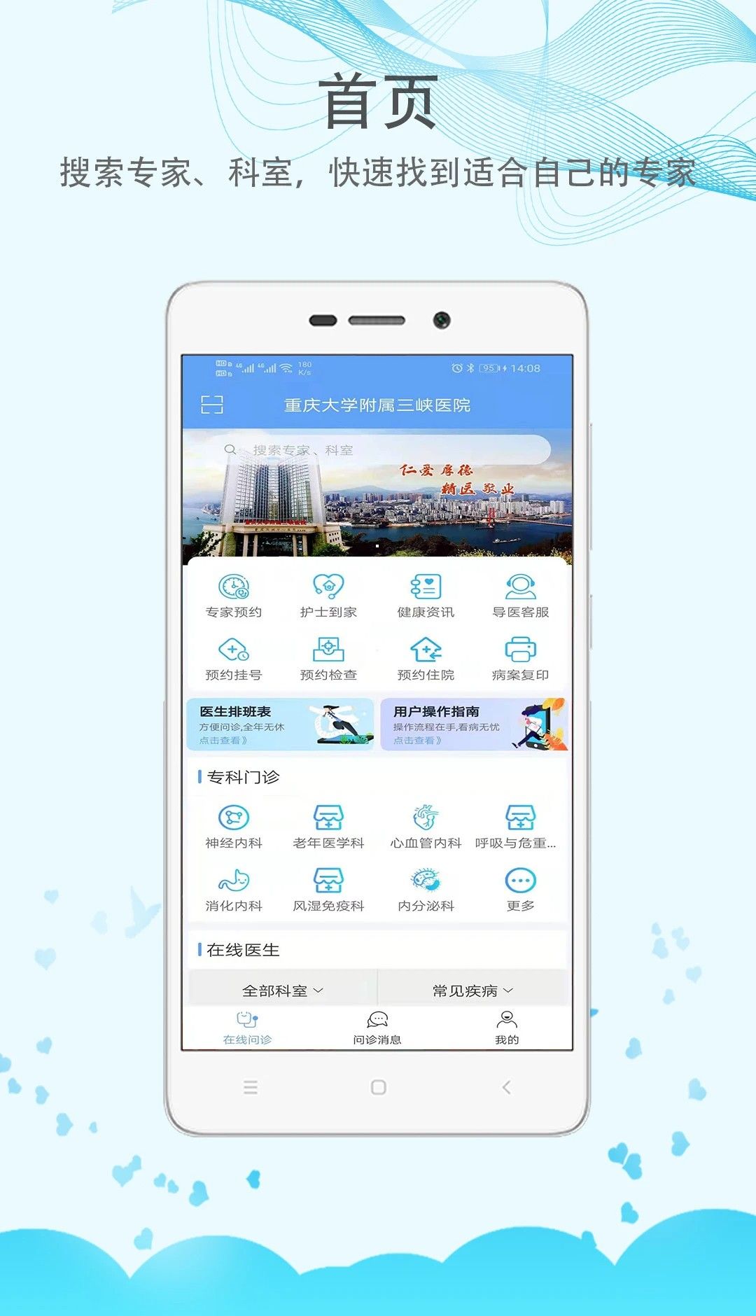 三峡医院是一款高人气的互联网医院软件,可以为用户提供便捷的移动医疗服务,随时随地快速访问各种医疗资源,轻松享受优质的医疗问诊,还支持文本咨询、视频咨询等,自由了解各种医疗健康问题,能完全满足所有使用需求,还可以查询医院的所有科室和医生信息,轻松关爱健康生活,还具有在线挂号功能,节省线下排队取号的时间,也能自由关注每一位医生,以便您将来可以快速找到医生进行医疗咨询,有兴趣的用户欢迎下载。