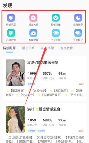 2、发现页面涵盖了情绪困扰、婚姻关系和抑郁症等专业心理咨询内容。