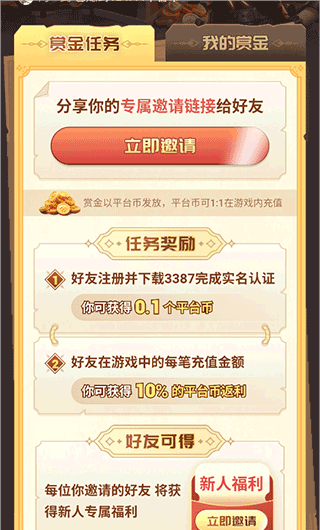 5、邀请好友一起玩平台会有平台币返利赏金领取。