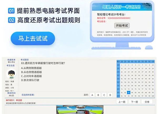 1、科目1和科目4模拟真实的考场,提前熟悉计算机考试界面,高度再现考试规则。