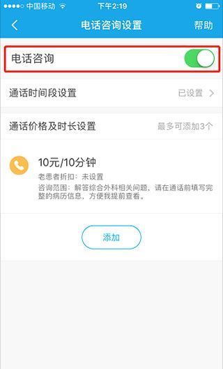 3、打开“电话咨询”开关,启动电话咨询服务。