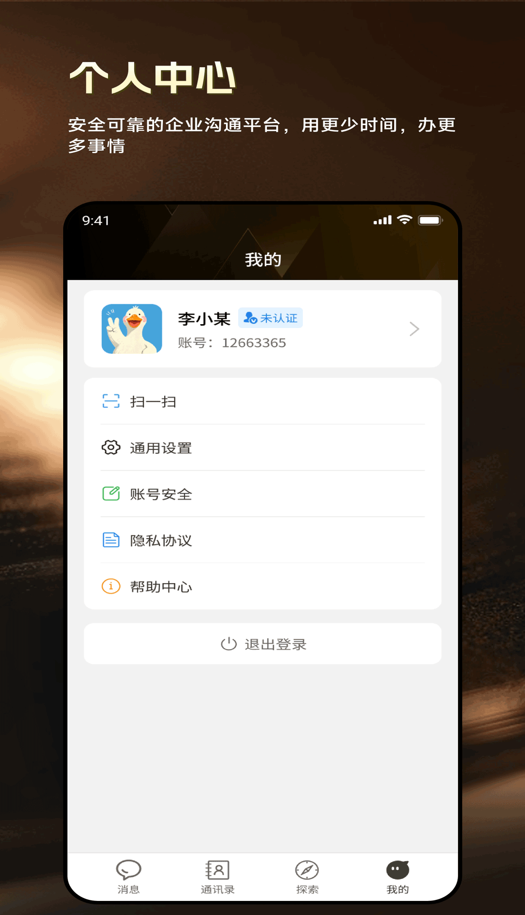 进入个人中心,完成通用设置、账号安全、隐私协议等配置,保障个人与企业沟通安全。
