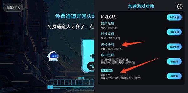 5、发现免费渠道人太多,可以通过做任务或邀请好友方式来获得免费时长和免排队福利。